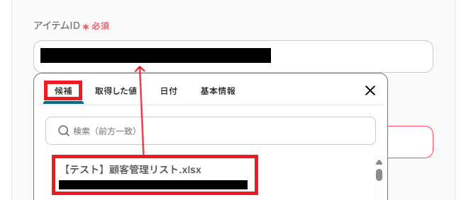 ・アイテムID:クリックし、候補から書類発行したいエクセルを選択します。