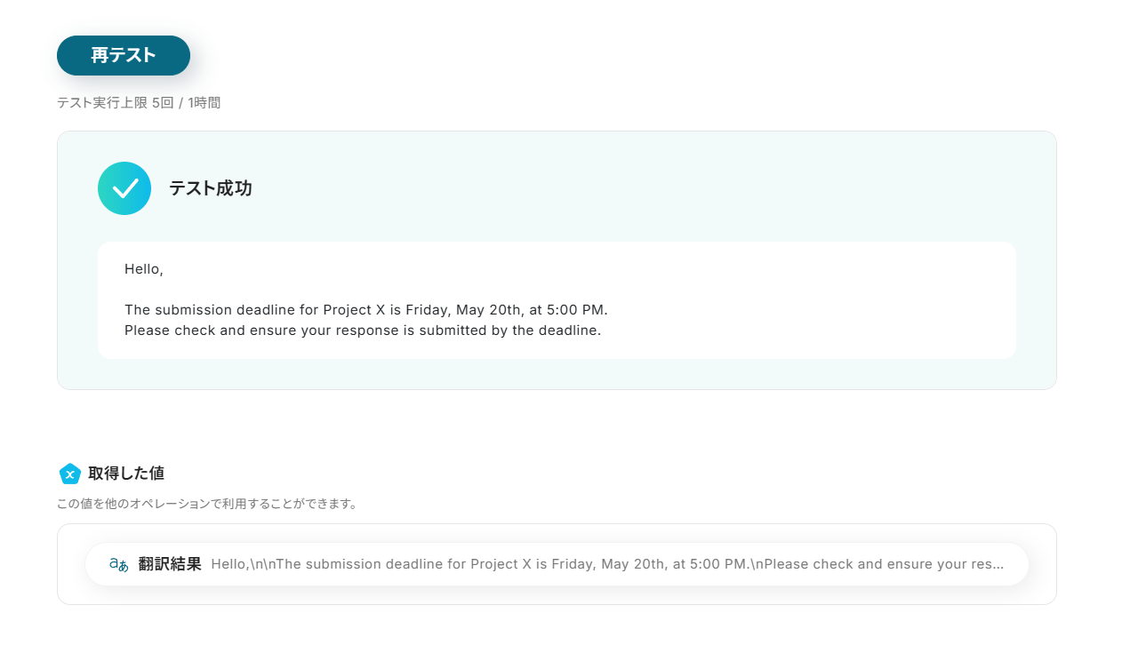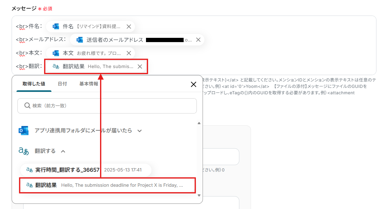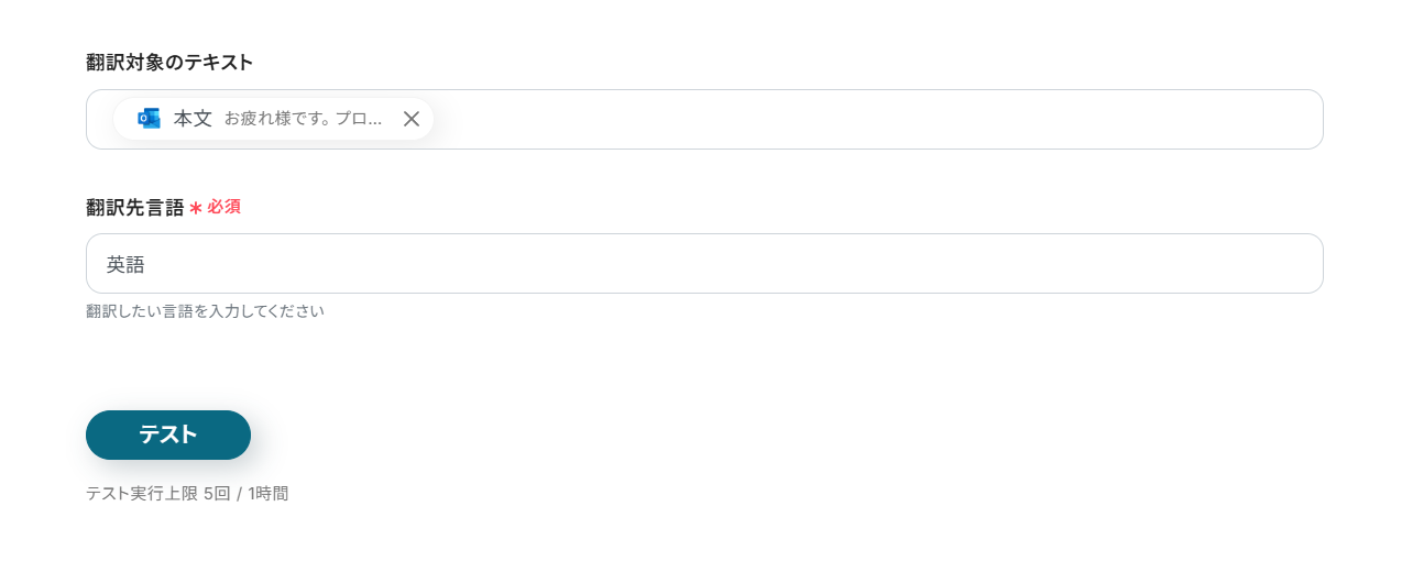 - 「翻訳対象のテキスト」にはデフォルトで、ステップ3で取得したメールの本文が設定されています。