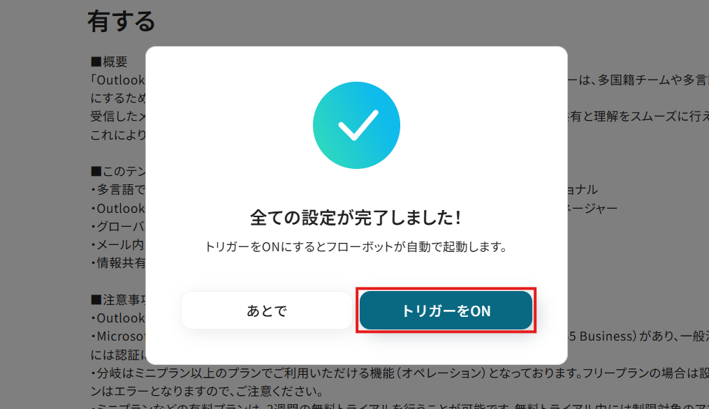 これでトリガーとなるメールフォルダの設定が完了しました。