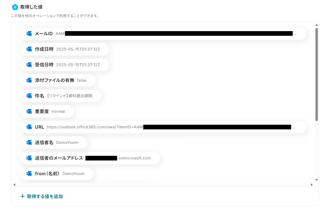 - テストに成功すると、「取得した値」に受信したメールの情報が追加されます。
