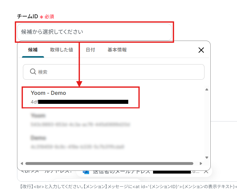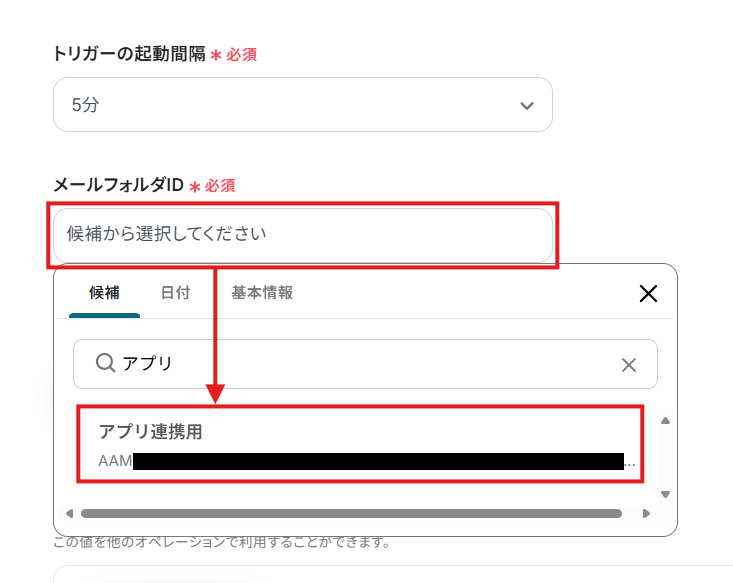 入力欄をクリックすると、連携しているOutlookから候補が表示されますので、対象となるメールフォルダIDを選択してください。