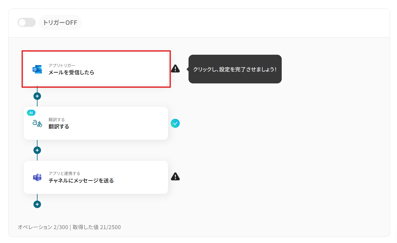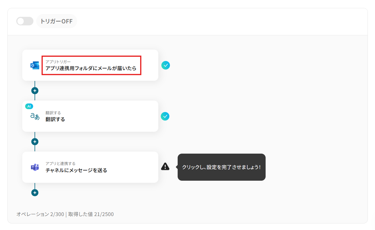 - OutlookのトリガーとAI翻訳・Microsoft Teamsのアクション設定