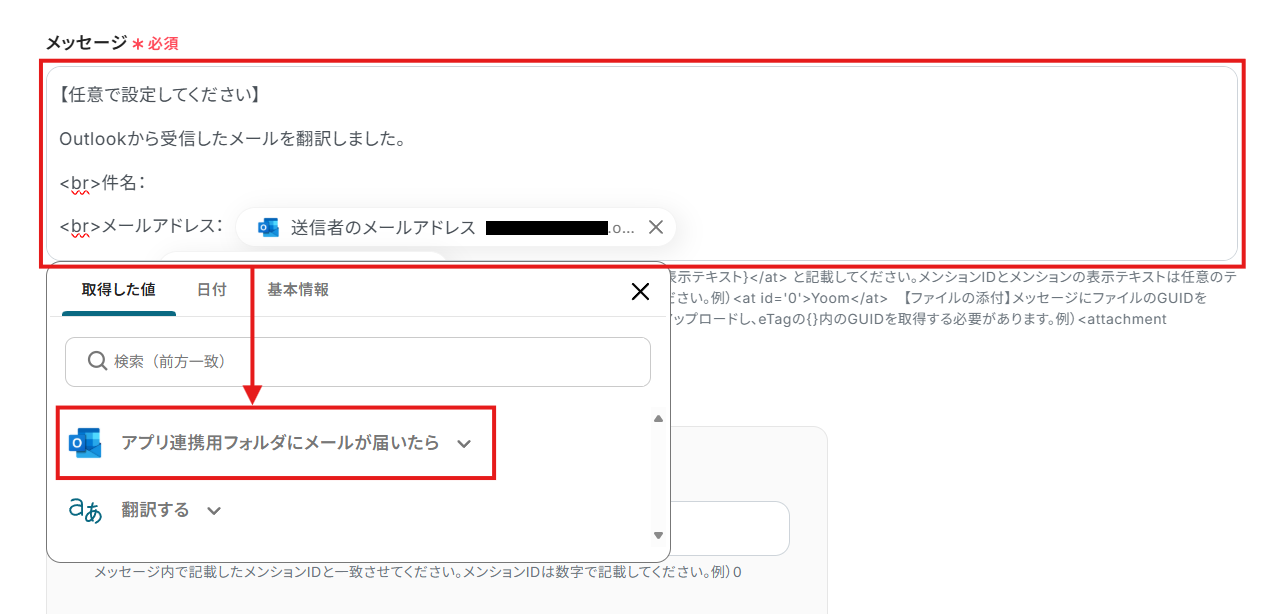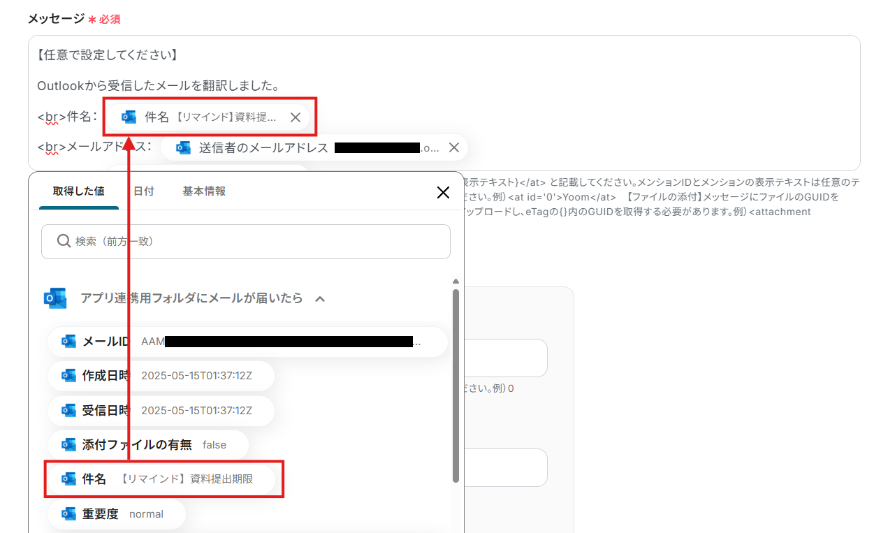これらの値を使用することで、受信したメールの内容や翻訳結果をMicrosoft Teamsに投稿することができます。