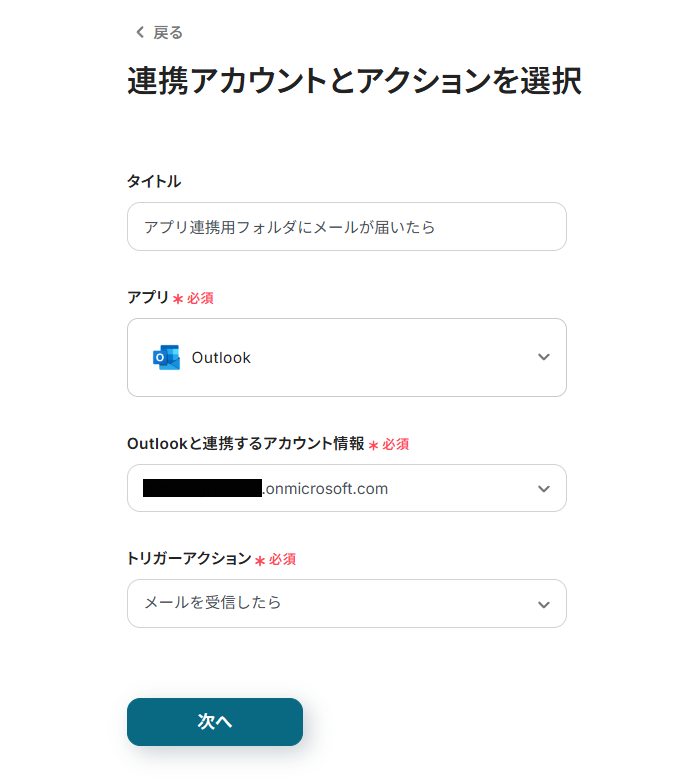 トリガーとなるOutlookのMicrosoftアカウントを入力し、「次へ」をクリック。