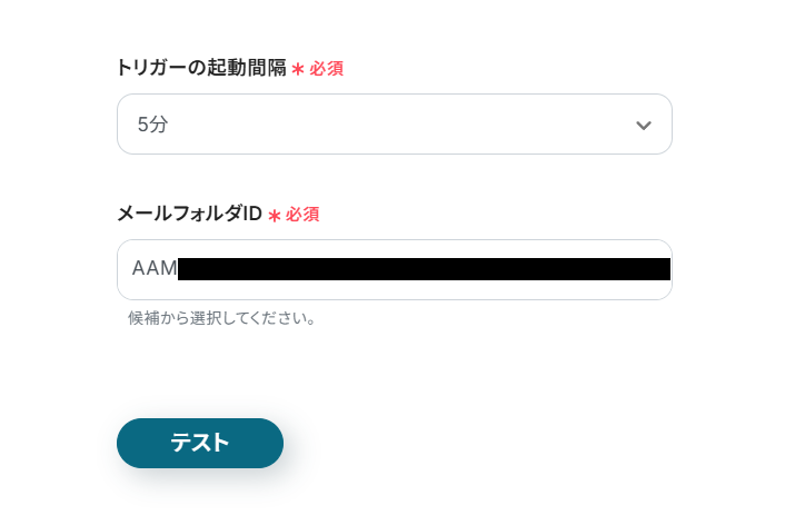 - 「メールフォルダID」に、トリガーとなるメールフォルダのIDを設定。