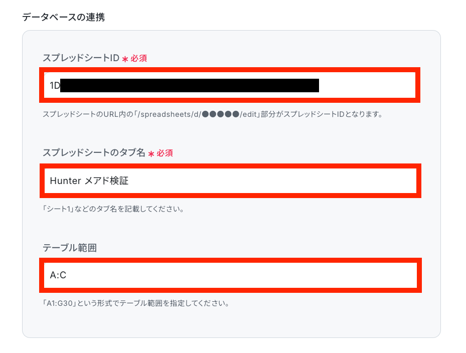 今回はGoogle スプレッドシートに記載ある全てのメールアドレスをHunterで検証したいので下の画像のように設定しました。