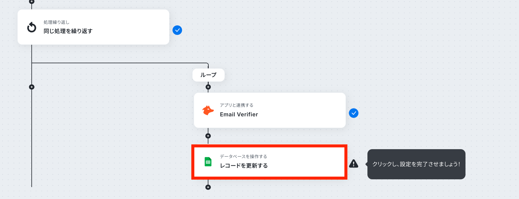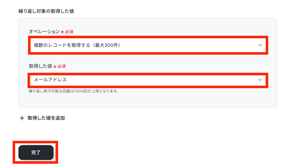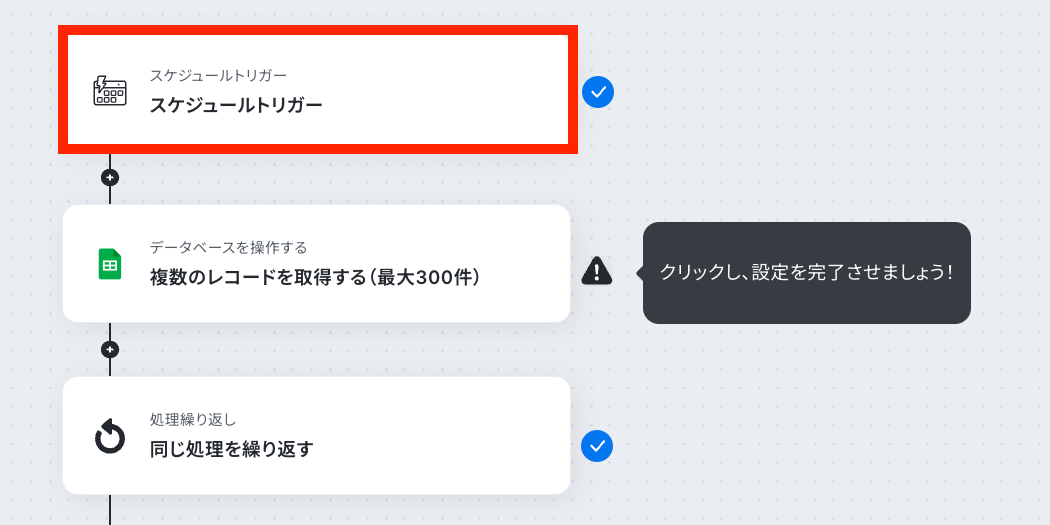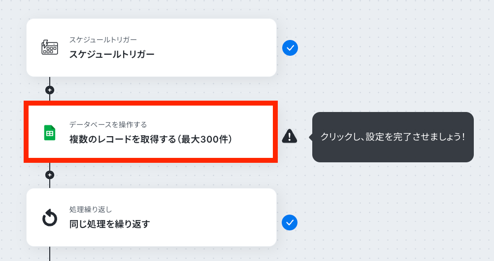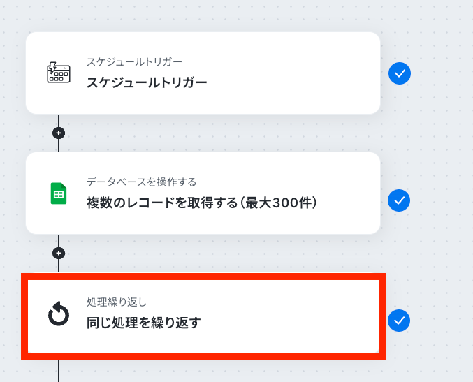 繰り返し設定をすることで、1件ずつデータを取得できるようになります。