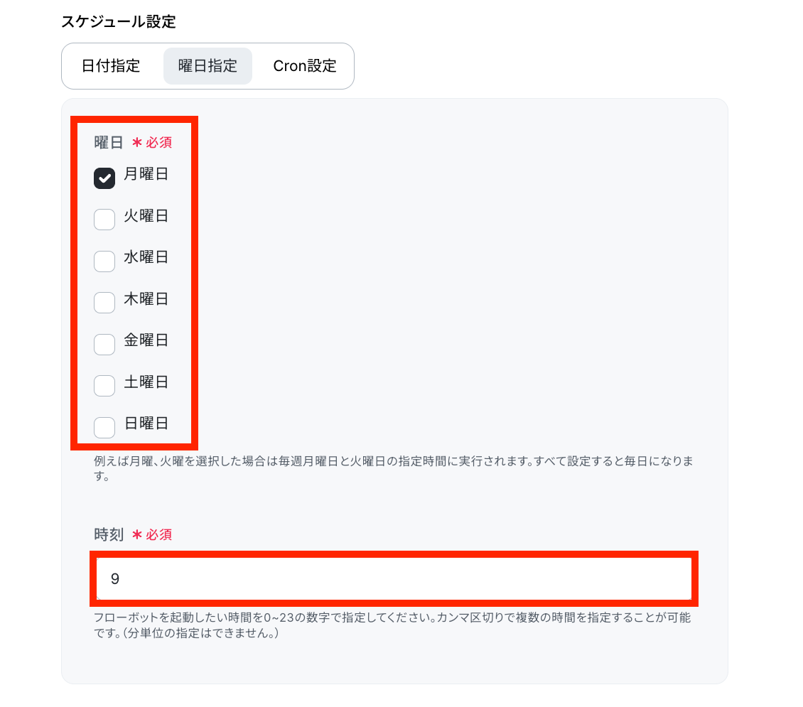 テンプレートでは「毎週月曜日9時」にフローボットが起動される設定となっていますが、曜日(日付)や時間は必要に応じて変更してください!