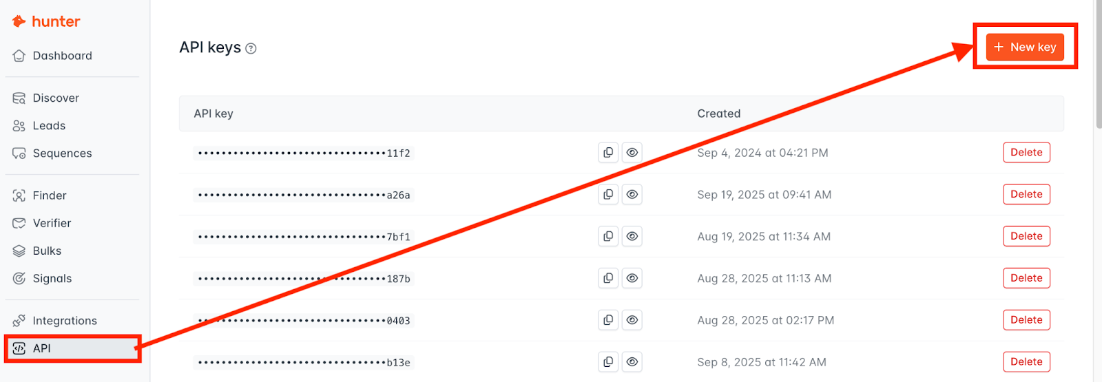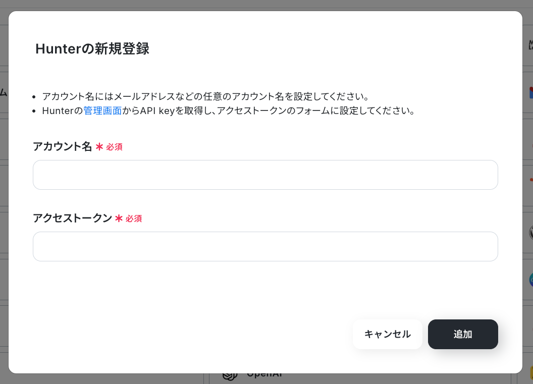 「アクセストークン」はHunterの管理画面からAPI keyを取得できます。