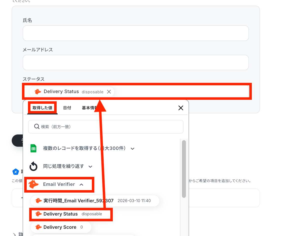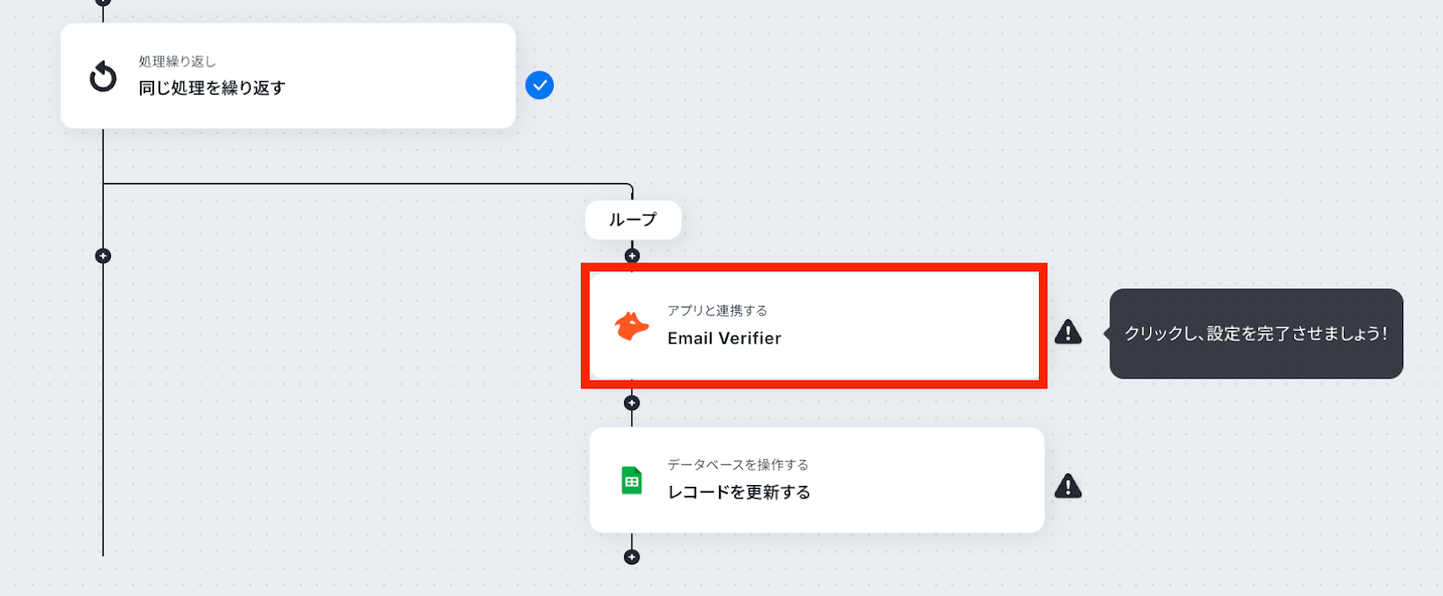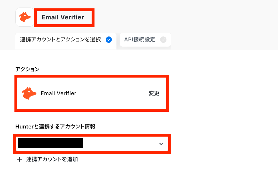 - 繰り返しの処理の中で、Hunterの「Email Verifier」アクションを設定し、メールアドレスの有効性を検証します。