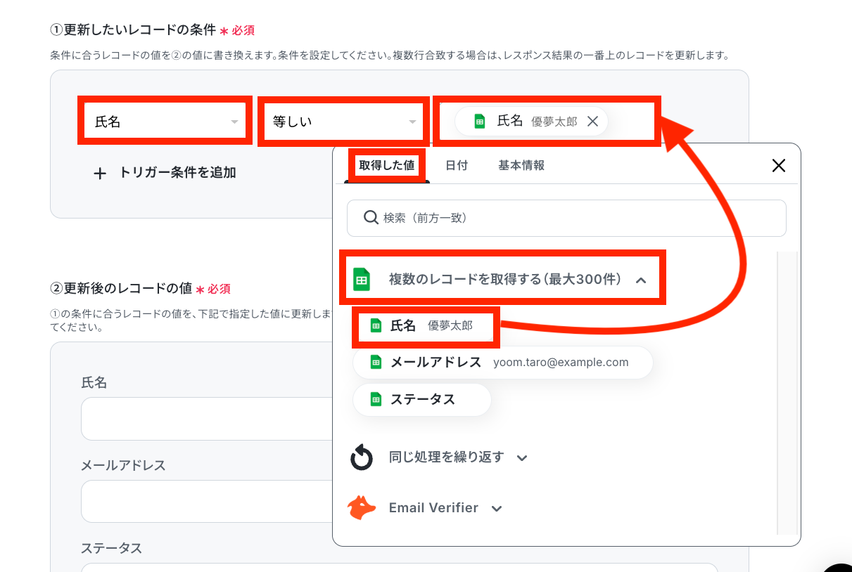 - 最後に、オペレーションでGoogle スプレッドシートの「レコードを更新する」アクションを設定し、Hunterの検証結果を元のシートに反映させます。