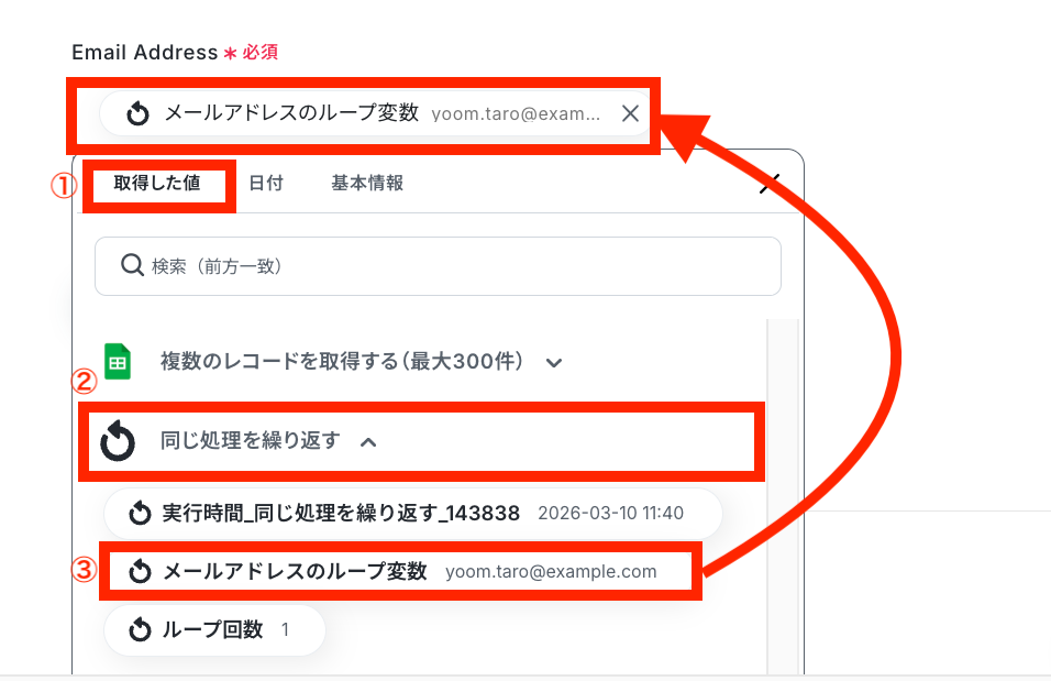 - 次に、繰り返し機能を使って、取得したメールアドレス一つひとつに対して処理を行うよう設定します。