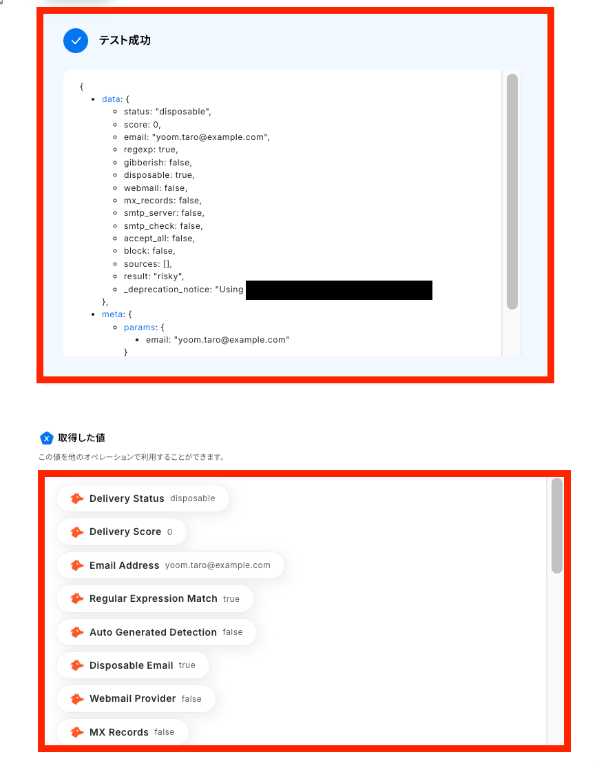 トリガーやオペレーション設定時に「テスト」を実行して取得した値のことです。