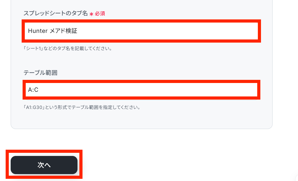 最後にGoogle スプレッドシートに合わせて「テーブル範囲」を設定したら「次へ」をクリックしてください。