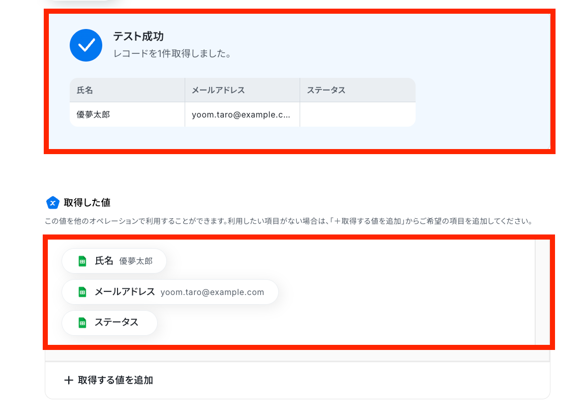 テストに成功すると、Google スプレッドシートのデータが「取得した値(※)」の欄に反映されるので、確認できたら「完了」をクリックしてください。