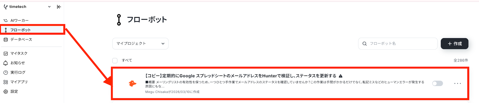 左側にあるメニューの「フローボット」から、コピーしたテンプレートを開きます。