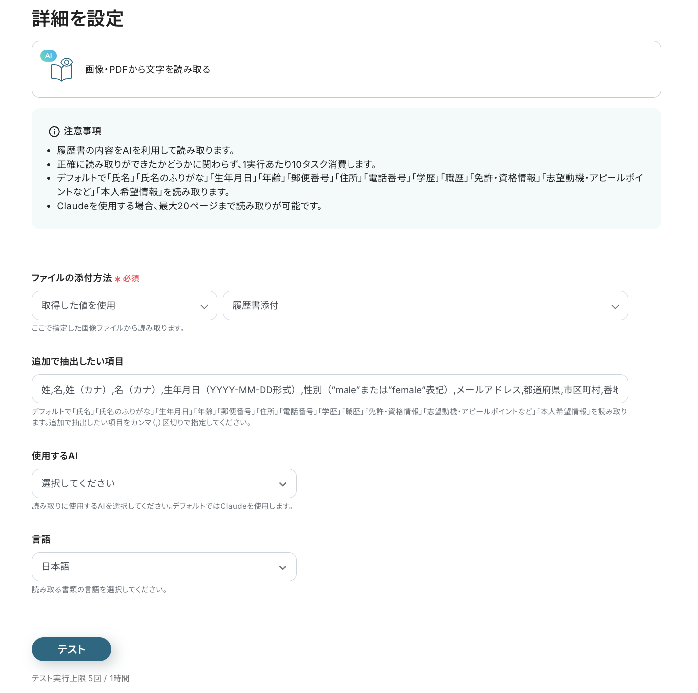 設定が完了したら「テスト」をクリックします。ステップ3で「取得した値」にアップしたテスト用ファイルから、抽出項目が正しく抽出できているかチェックしてください。