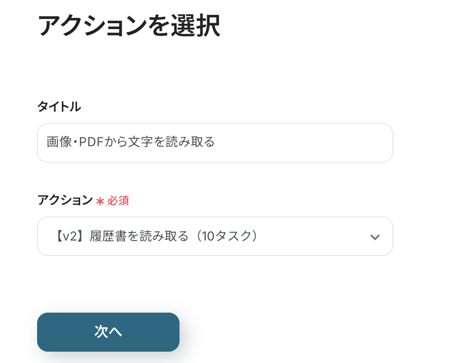 フォームから送信されたファイル(履歴書)から、OCRで読み取りたい内容を設定していきます。