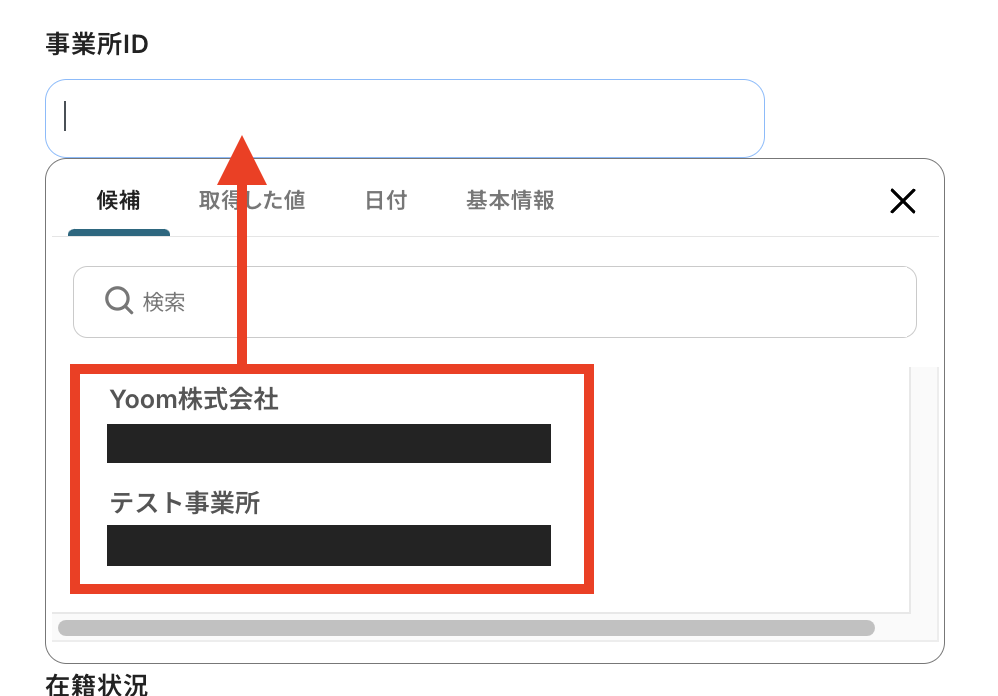 「事業所ID」は、入力欄をクリックして表示される候補から選択してください。候補は、連携しているアカウントに紐づいて表示されます。