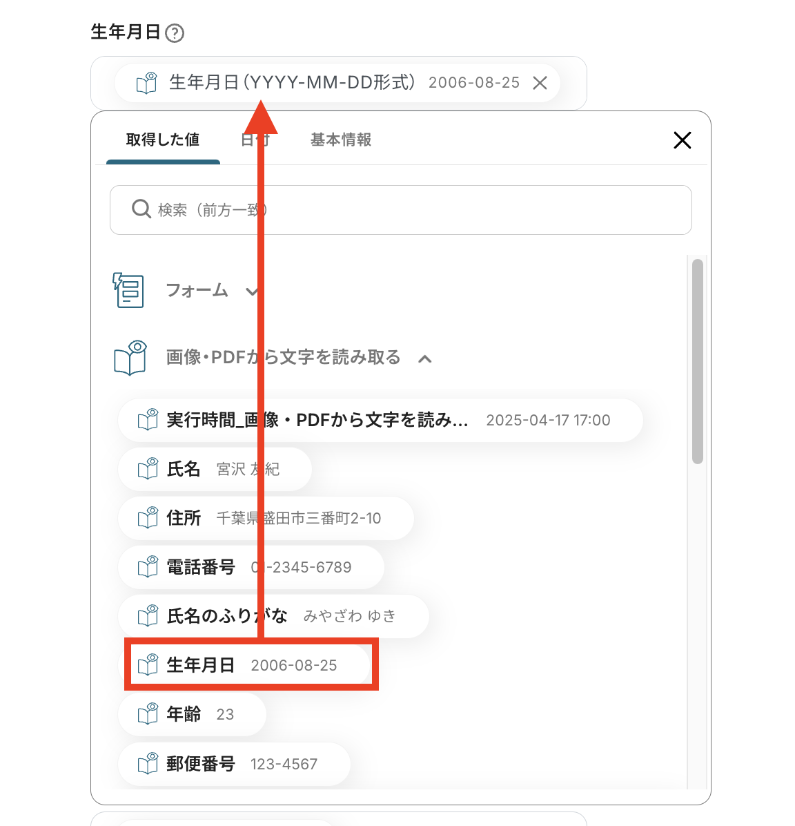 「生年月日」の項目には、OCRの抽出結果から「生年月日」を選択するといった具合に、各項目に合う適切な値を設定しましょう。