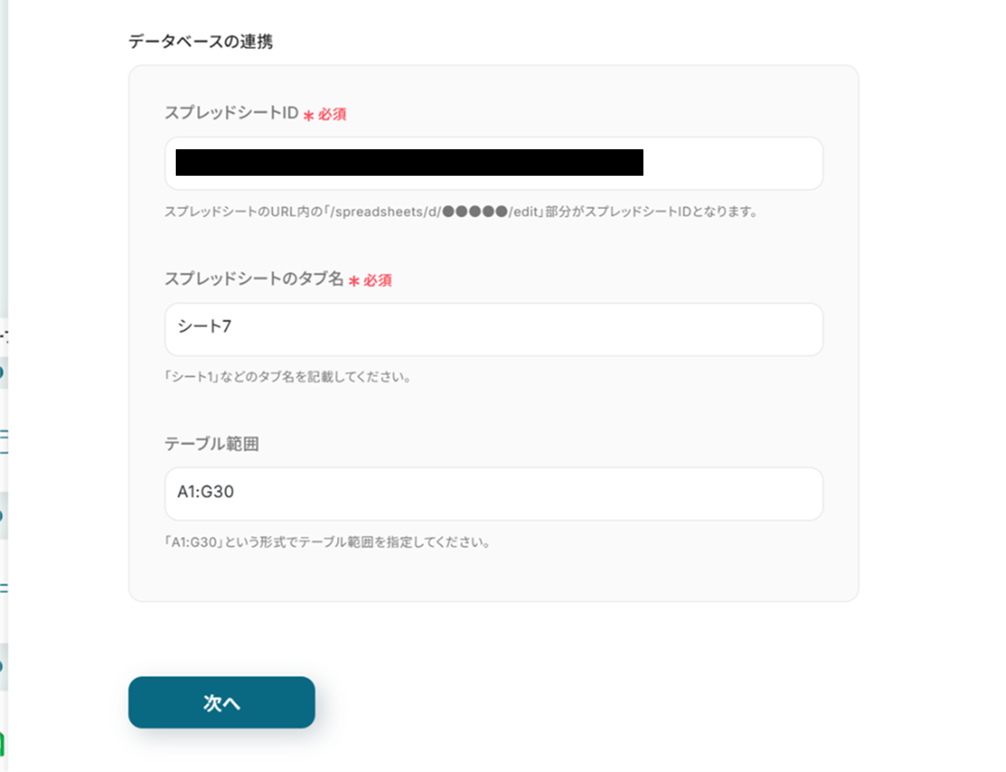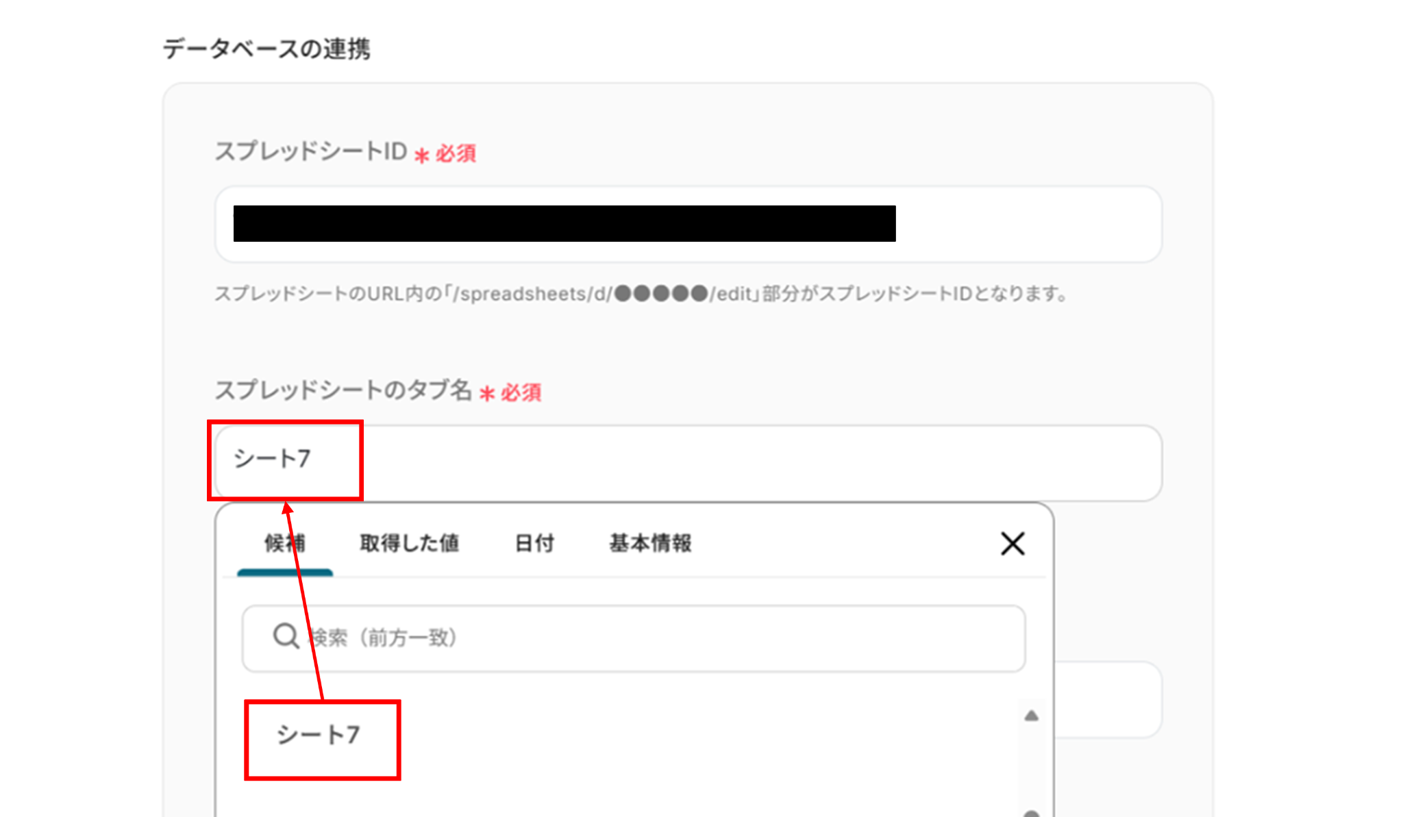 「スプレッドシートID」と「スプレッドシートのタブ名」は候補から選択します。