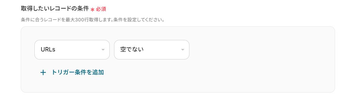 Google スプレッドシートの「複数のレコードを取得する」アクションは一度に取得できる件数は最大300件となります。