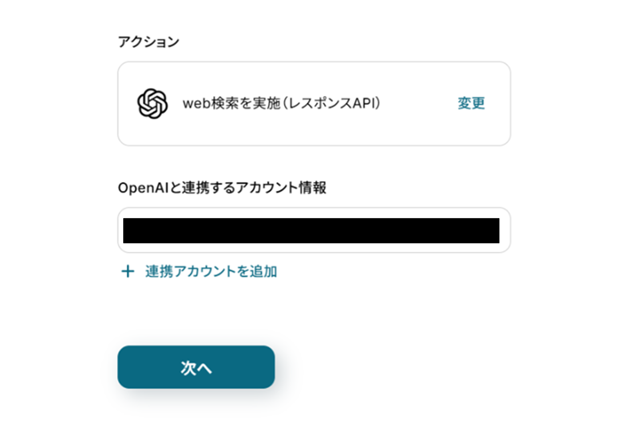 (2)「連携アカウントとアクションを選択」画面から、OpenAIと連携するアカウント情報に誤りがないかを確認し、アクションは「web検索を実施(レスポンスAPI)」のままで「次へ」をクリックしましょう。
