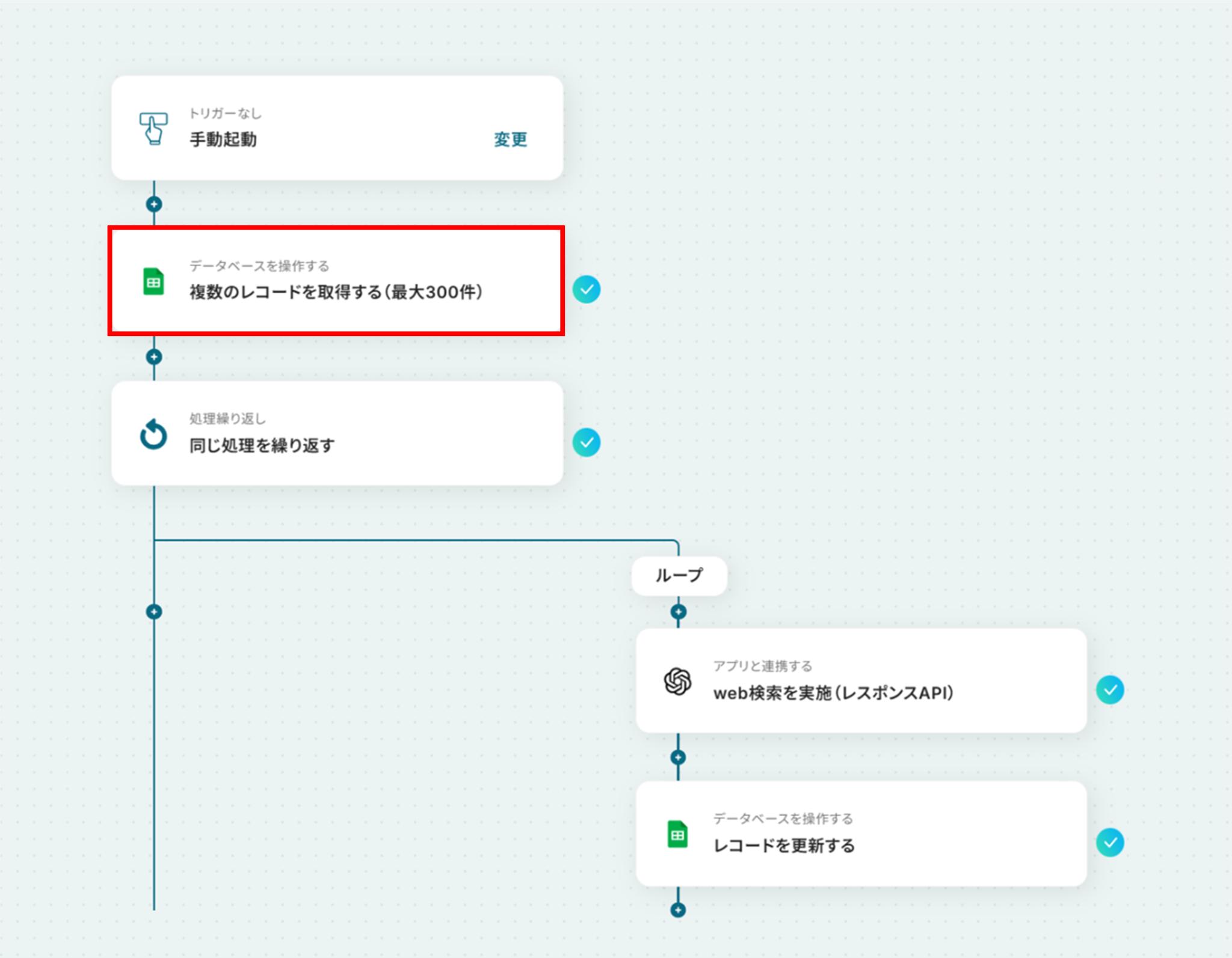 (3)それでは、Google スプレッドシートと連携して、複数のレコードを取得します。