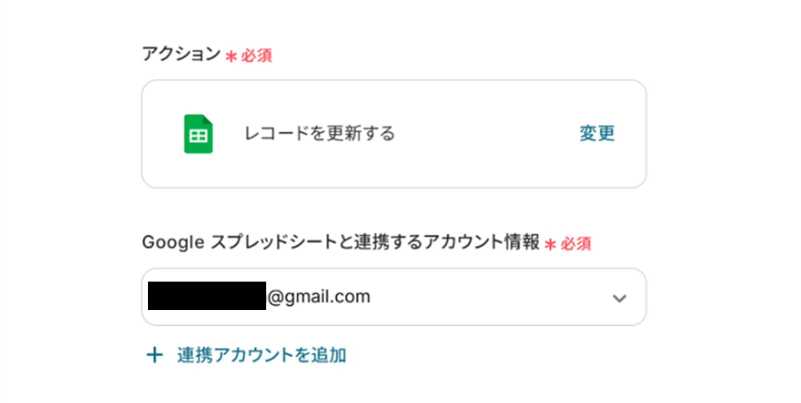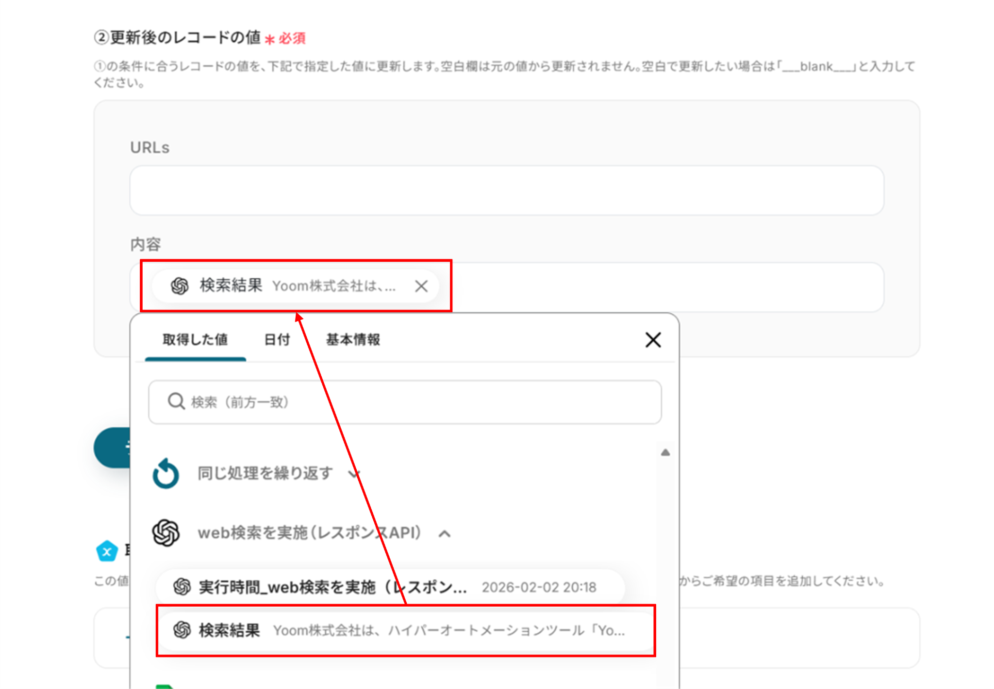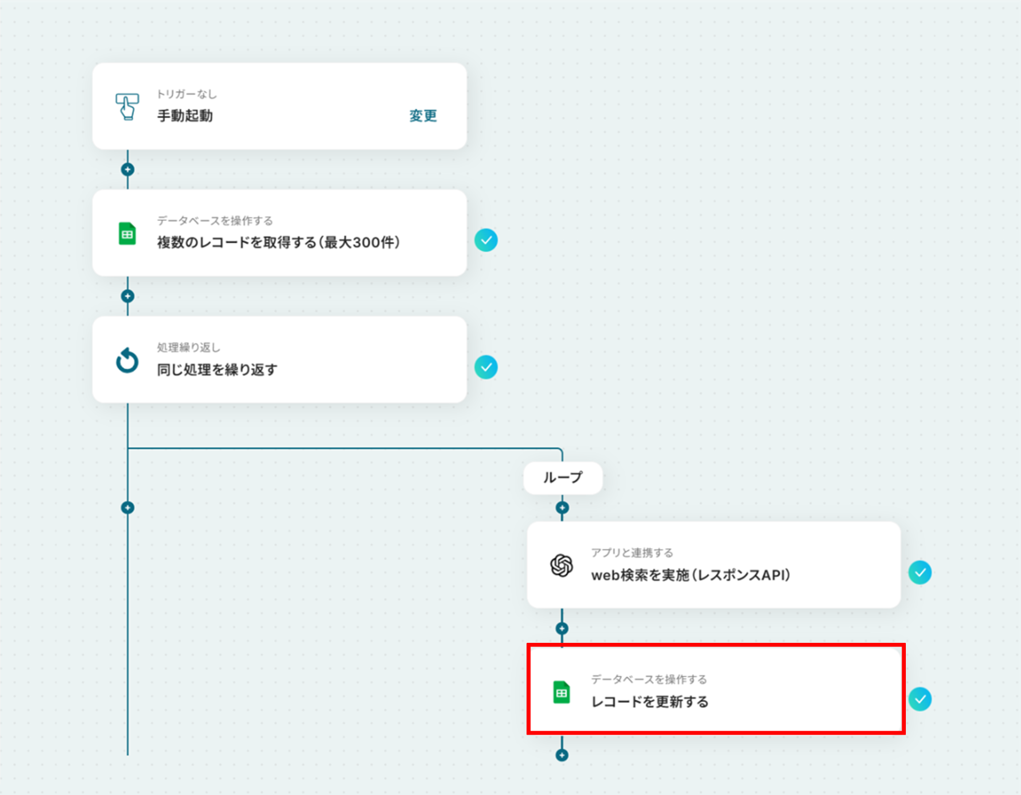 - 最後に、Google スプレッドシートの「レコードを更新する」アクションを設定し、OpenAIが取得した情報を元のシートに追記します。