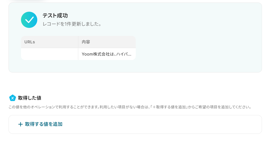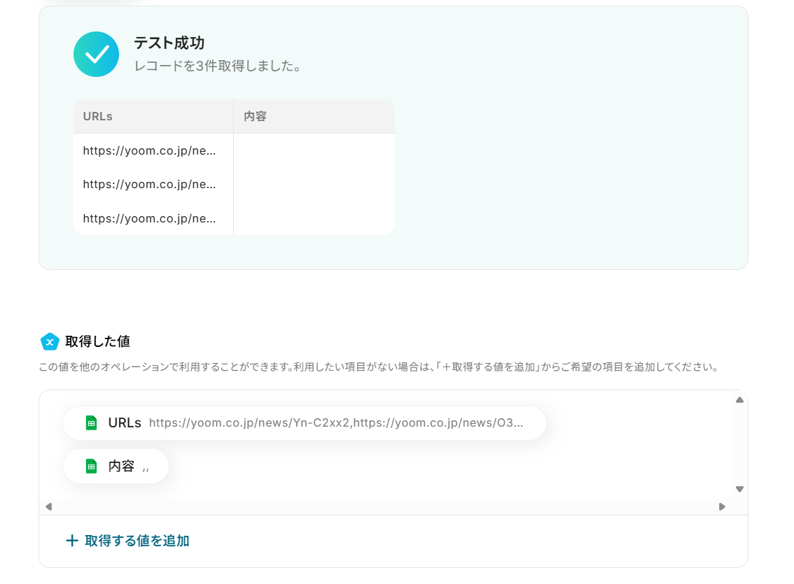 テストに成功すると「取得した値」にGoogle スプレッドシートの情報が反映されます。