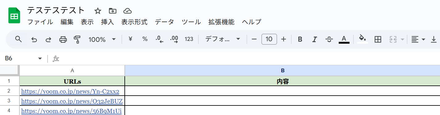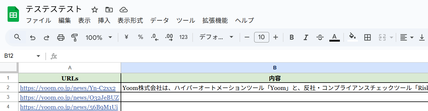 (2)Yoomで設定をする前に、Google スプレッドシートにテスト用のレコードを作成します。