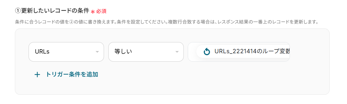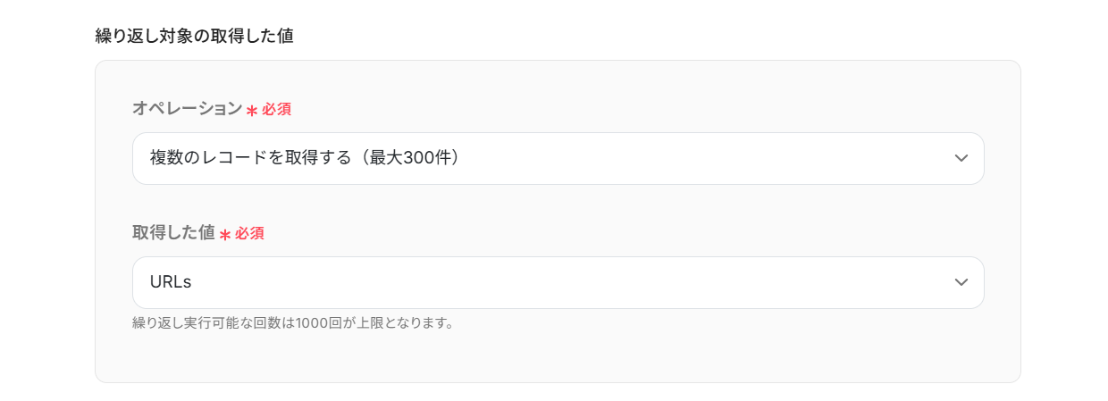 - 次に、オペレーションで「繰り返し機能」を設定し、取得したURLごとに後続の処理を実行するようにします。