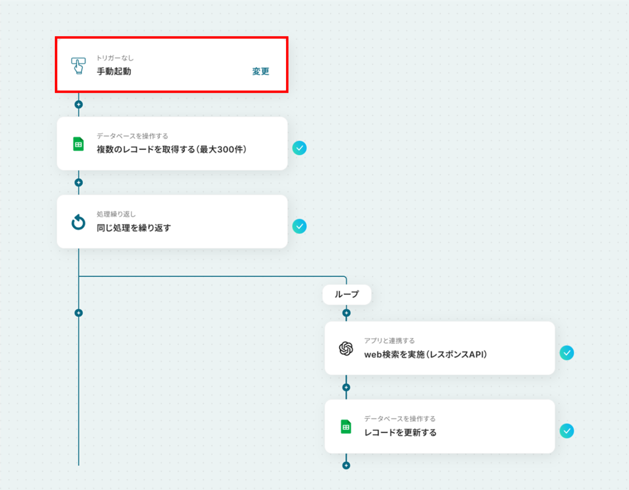 それではここから代表的な例として、Google スプレッドシートに記載された企業名リストをもとに、OpenAIが自動でWeb検索を行い、事業内容やURLなどの情報を追記するフローを解説していきます!