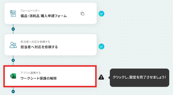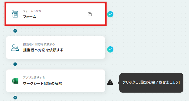 はじめに、Microsoft ExcelをYoomと連携します 次に、トリガーでフォームを選択し、「回答が送信されたら」というアクションを設定します 次に、オペレーションで「担当者へ対応を依頼する」アクションを設定し、任意の担当者に対応を依頼します 最後に、オペレーションでMicrosoft Excelの「ワークシート保護の解除」アクションを設定し、対象のワークシート保護を解除します ※「トリガー」:フロー起動のきっかけとなるアクション、「オペレーション」:トリガー起動後、フロー内で処理を行うアクション■このワークフローのカスタムポイント