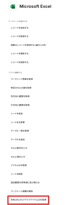 【解説 】共有URLからドライブアイテムIDを取得するアクションについて 「+」からMicrosoft Excelを追加し、「共有URLからドライブアイテムIDを取得」を選択します。