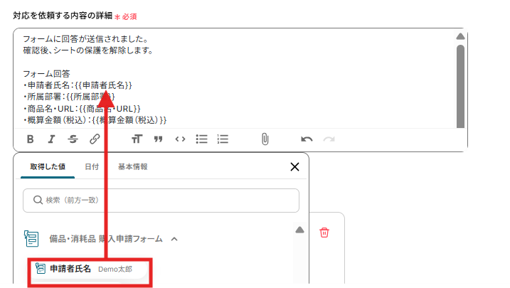 対応を依頼する内容の詳細にはフォーム回答で取得した値を活用できます。 取得した値を活用することで、固定値ではなく、トリガーが実行されるたびに最新の情報を反映 できます。