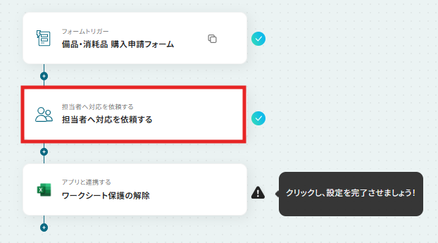 ステップ4:担当者へ対応を依頼する設定 フローに戻り、「担当者へ対応を依頼する」をクリックします。