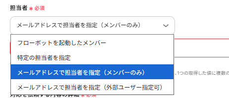 担当者を選択します。 今回は「メールアドレスで担当者を指定」を選択し、アドレスを指定しました。