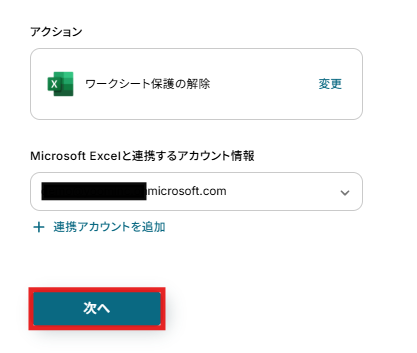 アクションは変更せず、アカウント情報がマイアプリ連携をしたアカウントと一致することを確認し、「次へ」をクリックします。