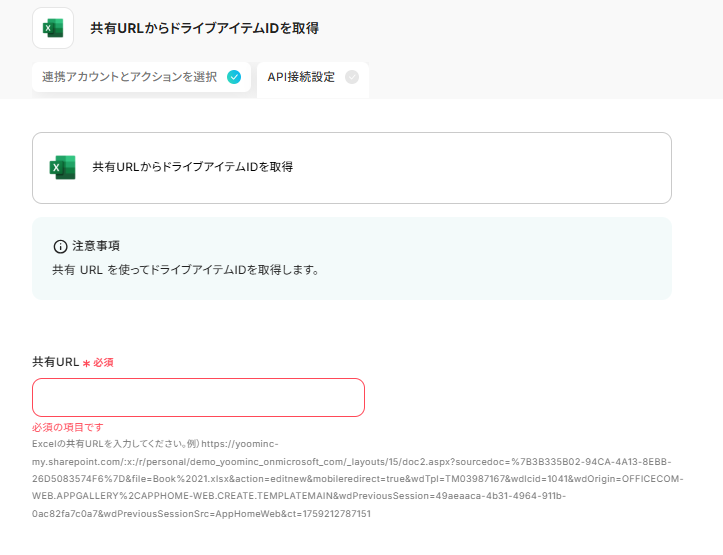 ドライブアイテムIDを入力します。 ドライブアイテムIDがわからない場合は以下でご紹介する「共有URLからドライブアイテムIDを取得」アクションを活用して設定することも可能です。