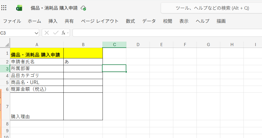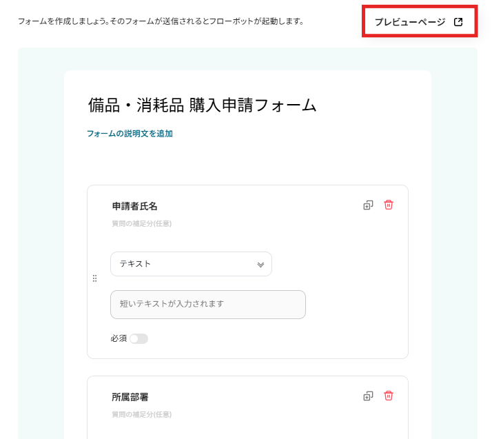 入力フォームを作成します。 今回は、備品・消耗品の購入申請を想定して回答フォームを作成しています。 申請者氏名、所属部署、品目カテゴリ、商品名・URL、概算金額(税込)、購入理由を設定しました。 取得したい情報にあわせて編集してください。 右上の「プレビューページ」をクリックすると実際の表記も確認することができます。