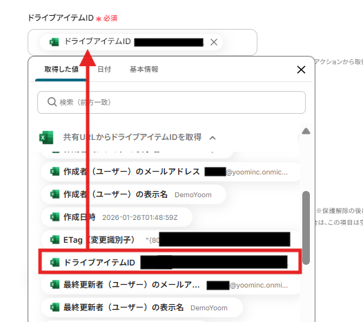以下のように取得した値からドライブアイテムIDの設定が可能になります。