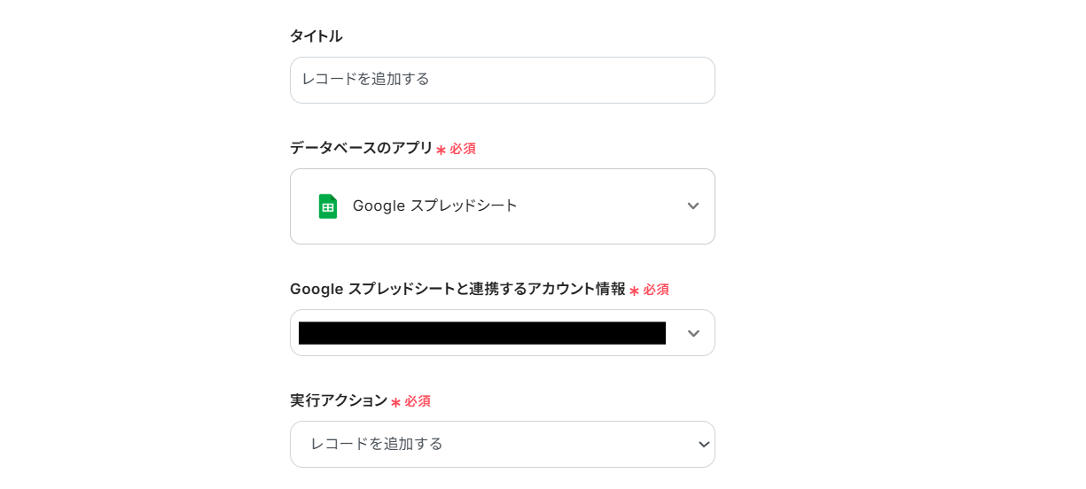 Google スプレッドシートと連携するアカウント情報はプルダウンから選択します。