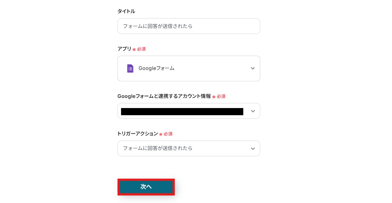 Googleフォームと連携するアカウント情報はプルダウンから選択します。