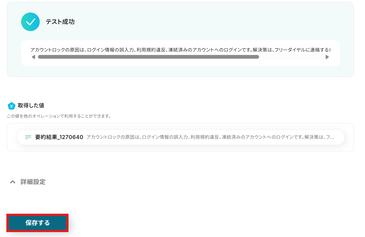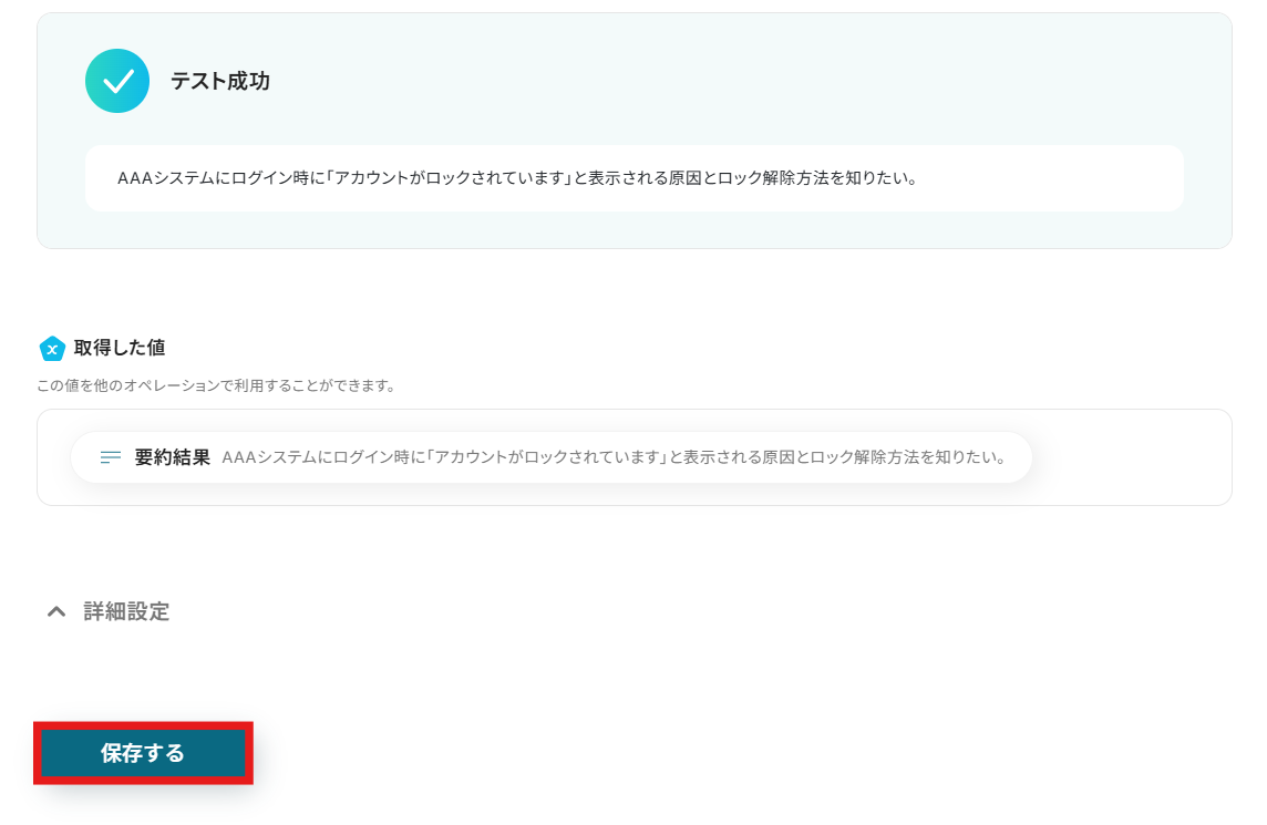 テストが成功したら、「保存する」をクリックするのを忘れないようにしましょう!