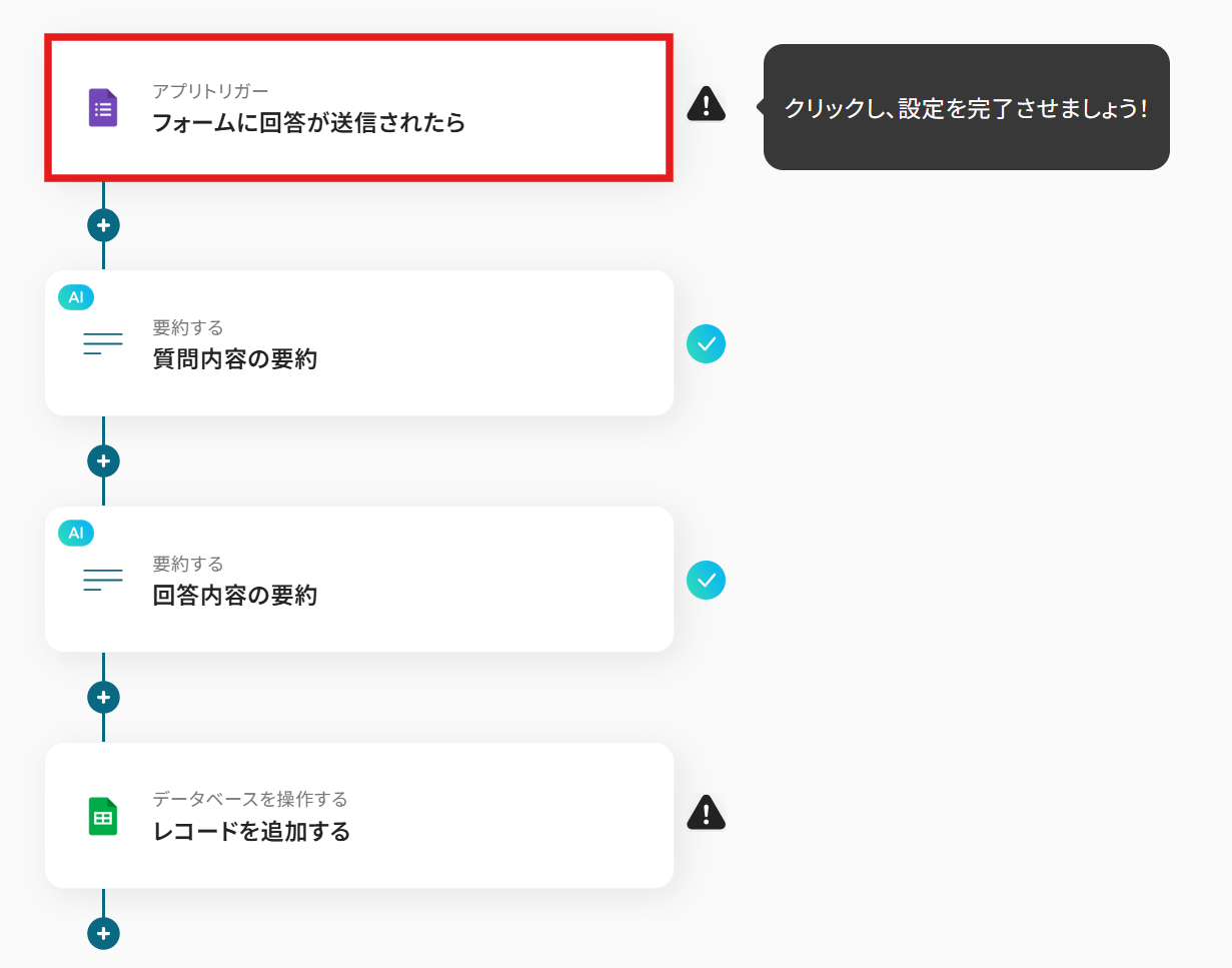 それではここから代表的な例として、Googleフォームで受け付けた回答内容を基に、AIがFAQを自動生成し、その結果をGoogle スプレッドシートに自動で追加していくフローを解説していきます!