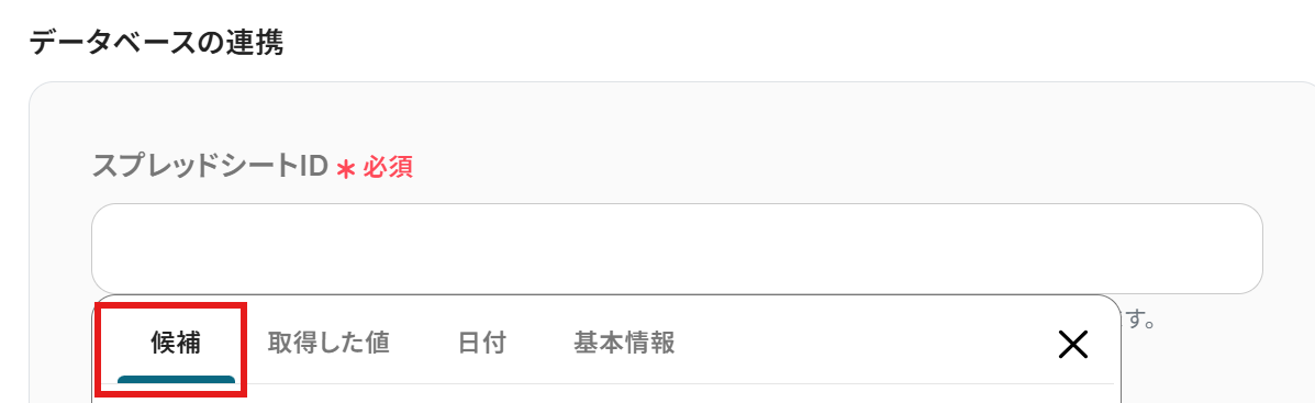 スプレッドシートID、スプレッドシートのタブ名:入力欄をクリックし、候補から選択しましょう。