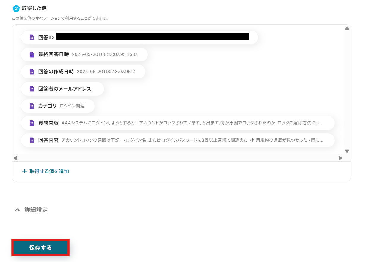 ・Googleフォームをトリガーとして使用した際の回答内容を取得する方法は下記を参照ください。