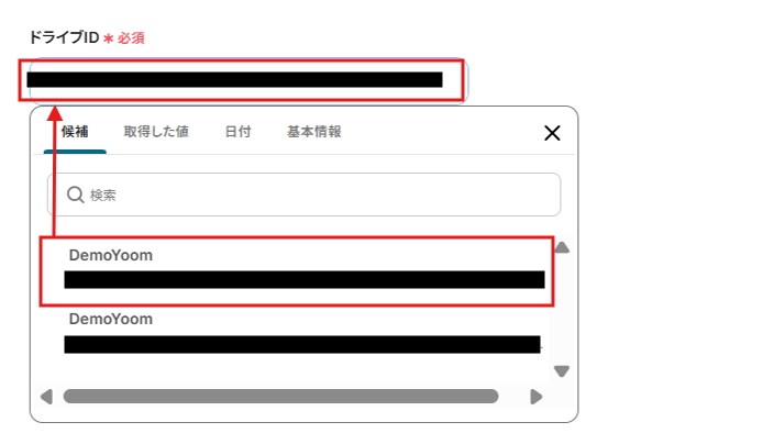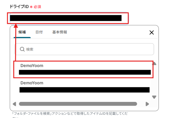 ドライブIDは、候補から選択しましょう。 OneDriveのドライブIDです。