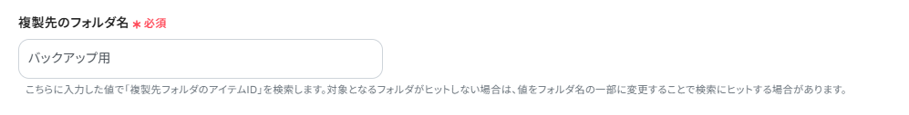 複製用フォルダ名を確認して入力するようにしましょう。 例えば、フォルダ名が「複製用フォルダ」であれば、「複製用」などと入力するイメージです。